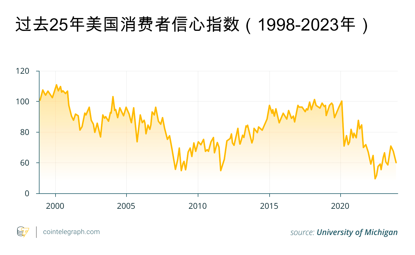 2023年,由密歇根大学公布的反映消费者对美国经济信心强弱指标的数值徘徊在2008年以来的最低点附近。这表明消费者信心已经很脆弱,为经济复苏蒙上了一层阴影。