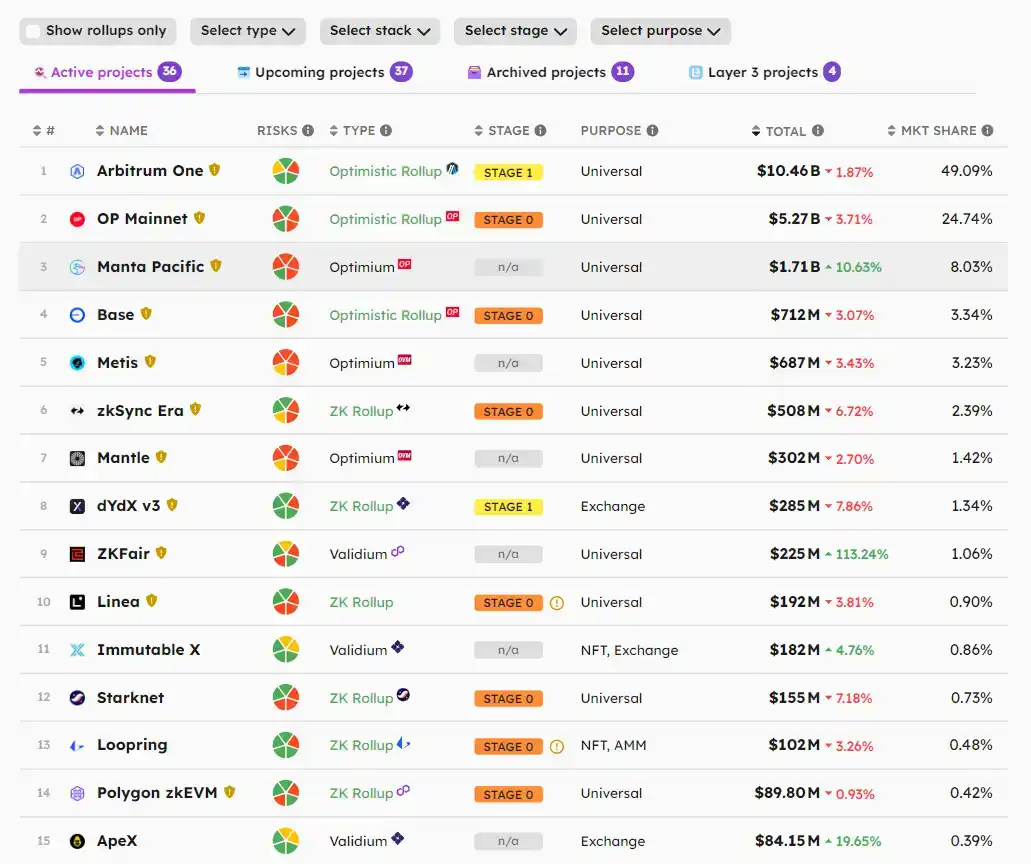 1 月 29 日,据 L2beat 数据,Manta Pacific TVL 突破 17 亿美元,目前是第三大 Layer2 生态。 另据 Analytix 数据,Manta Pacific 链上交易笔数超 1144 万,钱包地址 53.7 万,活跃地址 51.9 万,生态项目部署的已验证智能合约 1000 个。MANTA 当前暂报 3.57 美元。