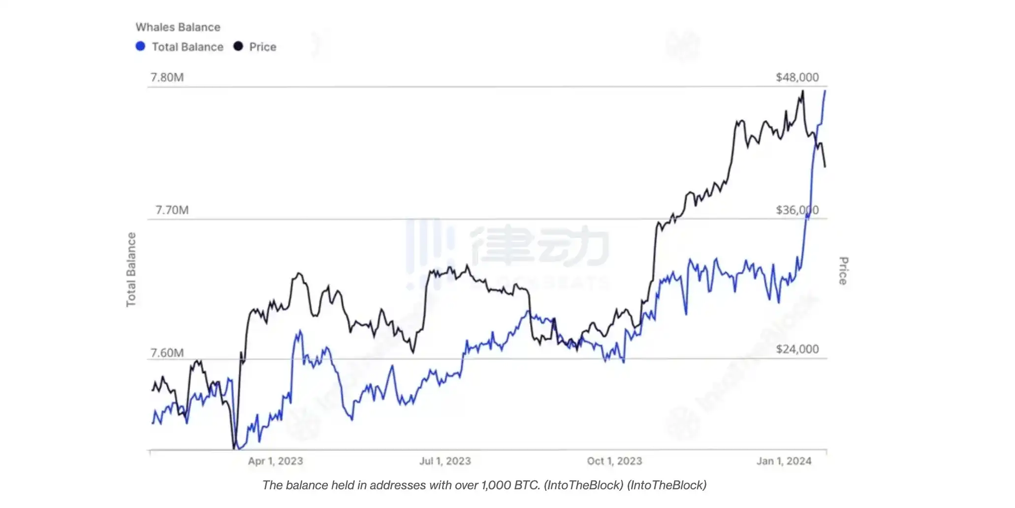 1 月 29 日,根据 IntoTheBlock 追踪的数据,加密鲸鱼或大型投资者本月已经积累了价值 30 亿美元的比特币(BTC)。 拥有超过 1,000 BTC 的钱包中持有的比特币数量增加了约 76,000 BTC,达到近 780 万 BTC。