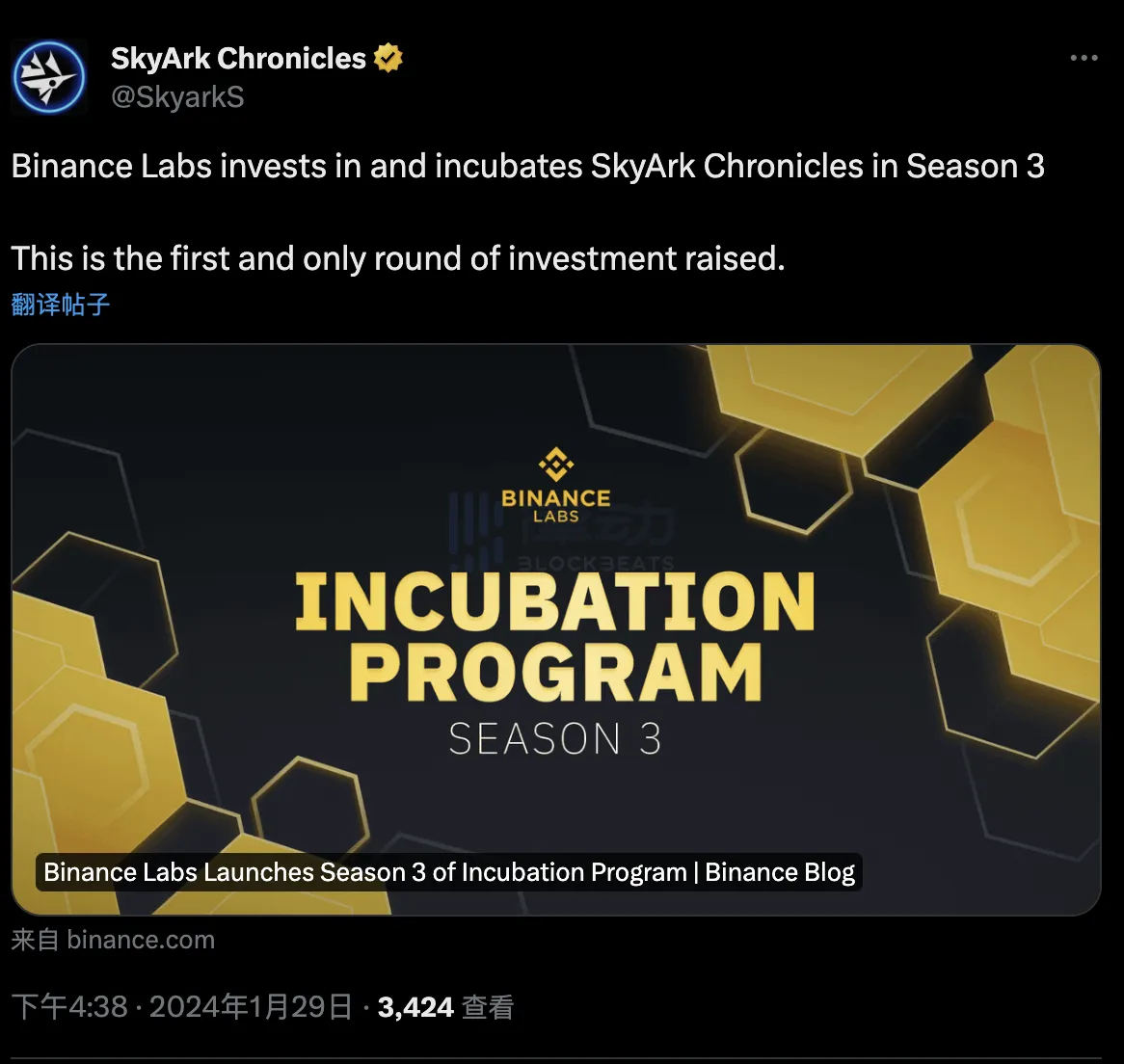 1 月 29 日,Binance Labs 在社交媒体平台澄清:「SkyArk Chronicles 是 Binance Labs 于 2021 年通过 Binance Labs 孵化器第三期孵化和投资的项目;Binance Labs 并未参与该项目今年官宣的最新一轮融资。」 3A 游戏平台 SkyArk Chronicles 曾于 1 月 12 日在社交平台上宣布完成 1500 万美元融资,由 Binance Labs 领投,目前相关链接已删除。
