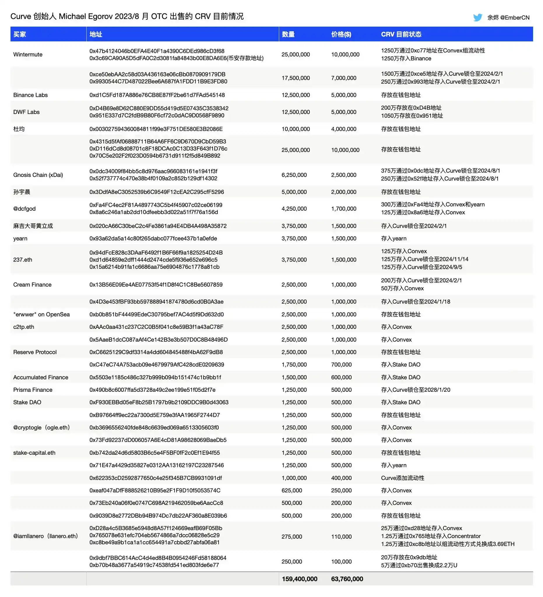 1 月 29 日,据链上分析师余烬,Curve 创始人 Michael Egorov 于去年 8 月通过 OTC 出售的 1.594 亿枚 CRV 将在 2 月 1 日结束 6 个月的锁定期。此前,Michael Egorov 为避免他在多个 DeFi 平台的借款遭受清算,以低于市场价 30% 的价格出售这些代币,这些代币有 6 个月的锁定期 (「道德锁仓」即便违反也不会受到惩罚 / 影响 )。绝大多数投资者都很好的遵守了锁定,将 CRV 存放在钱包、存入 Curve 锁仓或 Convex。仅有 2 位小额出售了一些 CRV(1.25 万 CRV 和 5 万 CRV)。