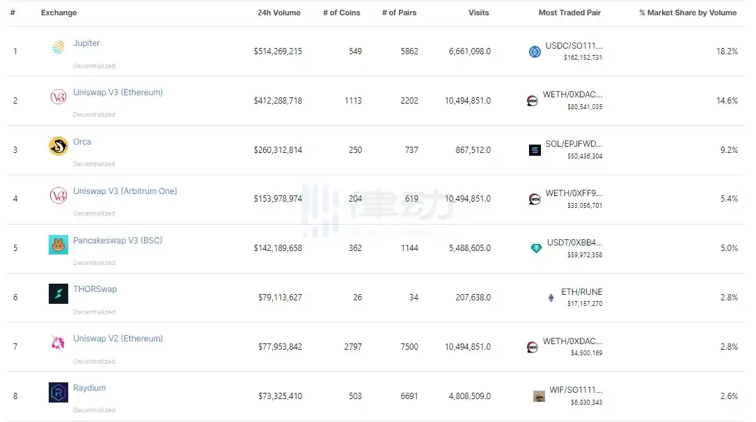 Jupiter 过去 24 小时交易量超 5 亿美元,位列 DEX 交易量排行榜榜首