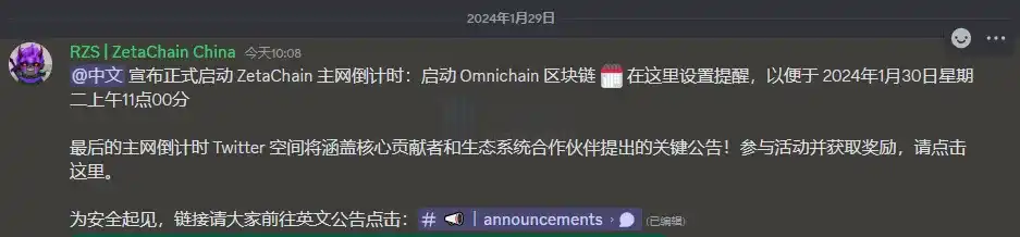 1 月 29 日,据官方社区公告,ZetaChain 将于 1 月 30 日 11 时启动主网。