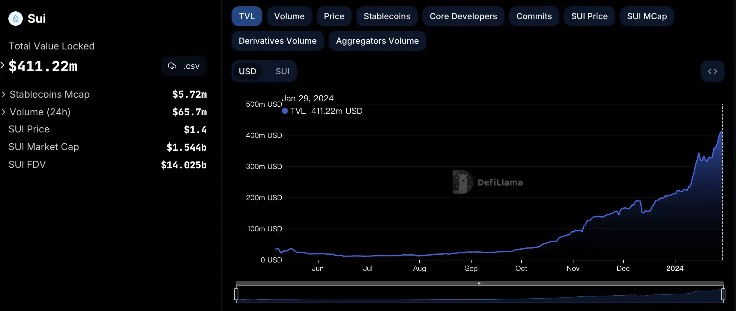 1 月 29 日,据 DefiLlama 数据显示,公链 Sui 上 TVL 已超过 4.1 亿美元,跻身区块链 TVL 前十名。