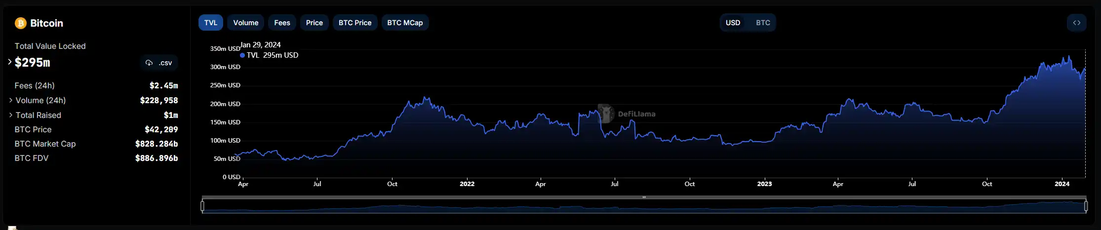以市值只有比特币三分之一的以太坊为例,其生态占其总市值的 20%,链上资产约 500 亿美元。如果以这个比例计算,比特币生态至少应有 2000 亿美元的发展空间。然而,目前比特币生态上的质押资产仅为 3 亿美元。这表明比特币生态具有高达 600 倍的增长潜力,展现出其发展前景的巨大潜力。