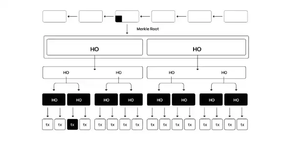 · 通过遍历区块链节点头的哈希,协议定位并确认计算出的交易哈希是否存在于链中,并获取包含此交易的区块高度。