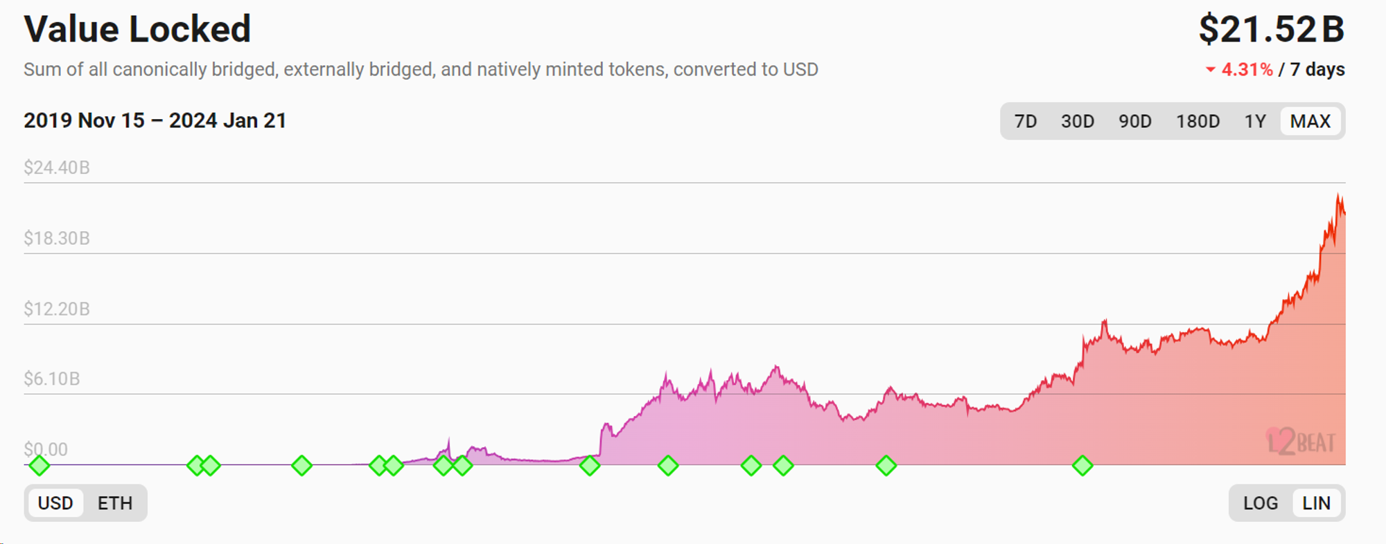 首先,扩容的需求依然存在,且扩容依然是实现 Web3 Mass Adoption 的关键技术。虽然现有的 Layer2 初步解决了扩容的需求,但 Dapp 之间依然要争夺 Blockspace,尤其是对于 Transaction-heavy 的用例(尤其是游戏和 socialfi),大幅增长的交易费用和较长的等待时间依然影响用户体验。牛市时交易量大幅增加时,对扩容的需求也将进一步增加。事实上,不断增长的 TVL 也反映了市场对 L2 的需求,L2 在 2023 年以来保持着高速增长的态势。