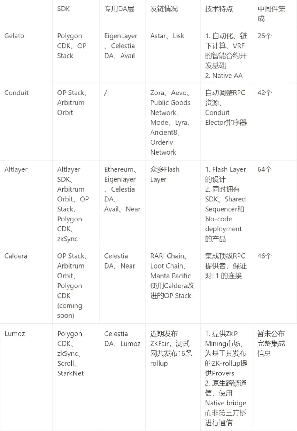 Gelato 创建于 2019 年,最初帮助开发者创建自动化的、无 gas 费的和可以进行链下计算的智能合约,并在这一领域处于领先地位。2023 年 9 月,Gelato 完成向 RaaS 平台的转型,继承了其在智能合约开发的技术和在基础设施生态积累的优势,在这一赛道具有不可小视的竞争力。