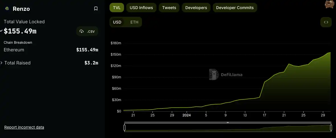 据 Defillama 数据,当前 Renzo TVL 达 1.55 亿美元,月涨幅达 1368%,金库中储存的 ezETH 达 67109 枚。