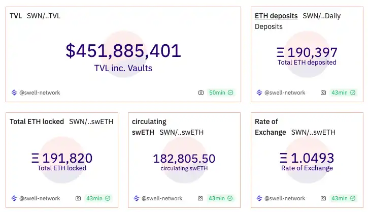 据 Defillama 数据,当前 Swell Network TVL 达 4.51 亿美元,其中金库中储存的 swETH 达 191,070 枚,rswETH 为 1,475 枚。
