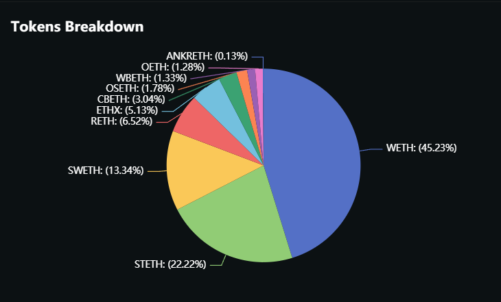 据 Defillama 数据,当前 EigenLayer 总 TVL 为 20.45 亿美元,金库中占比前三的 ETH 及其衍生品分别为:WETH(45.23%)、STETH(22.22%)、SWETH(13.34%)。