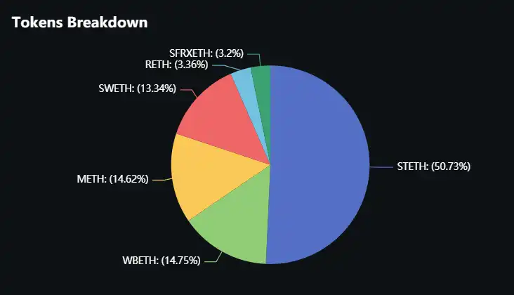 据 Defillama 数据,当前 Eigenpie 总 TVL 达 1.11 亿美元,金库中占比前三的以太坊衍生品分别为:STETH(50.73%)、WBETH(14.75%)、METH(14.62%)。