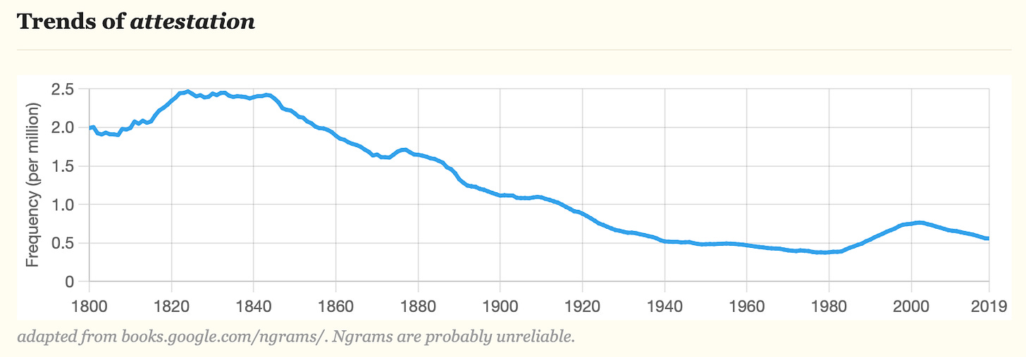 先从词源来看,Attestation 起源于 15 世纪中叶,意思是「testimony」(证词)或「a declaration in support of a fact」(支持事实的声明)。Verification 的起源略早一些,意思是「confirmation」(确认)或「corroboration」(确证)。根据近两百年的文献字频统计来看,Verification 使用的频率逐年提升,而 Attestation 则相反,而且 Verification 的词频是 Attestation 的十倍以上,可见 Attestation 是一个相对小众的词。