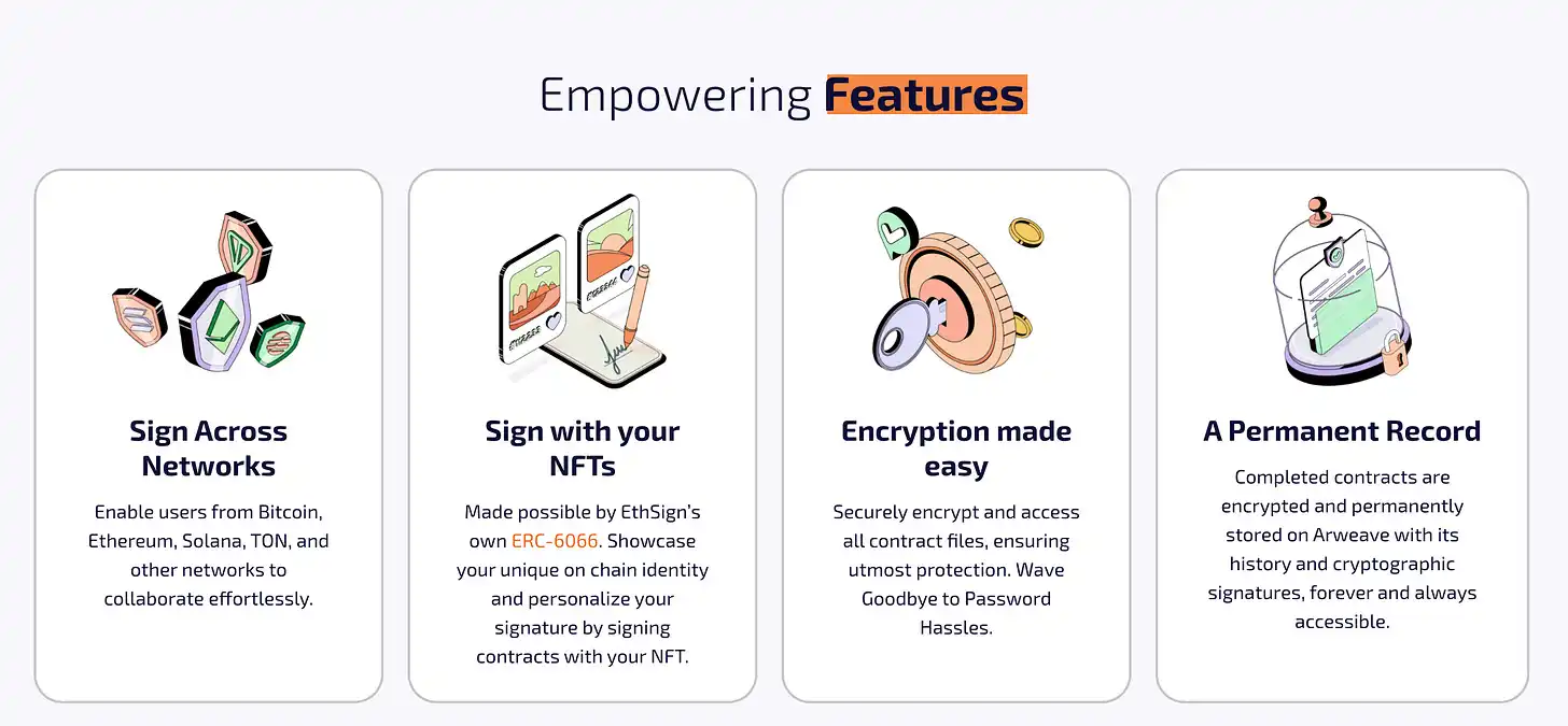 EthSign 是一个基于区块链的文档签名协议,其主要目的是允许用户在去中心化、安全和可验证的环境中进行文件签名、加密和永久存储。EthSign 允许来自不同区块链系统的用户使用其加密密钥对文件进行数字签名和加密。这意味着比特币用户可以与以太坊用户、其他区块链生态系统的用户一起协作,实现合同签订等。EthSign 利用 Arweave 区块链进行永久存储,用户无需支付任何费用。