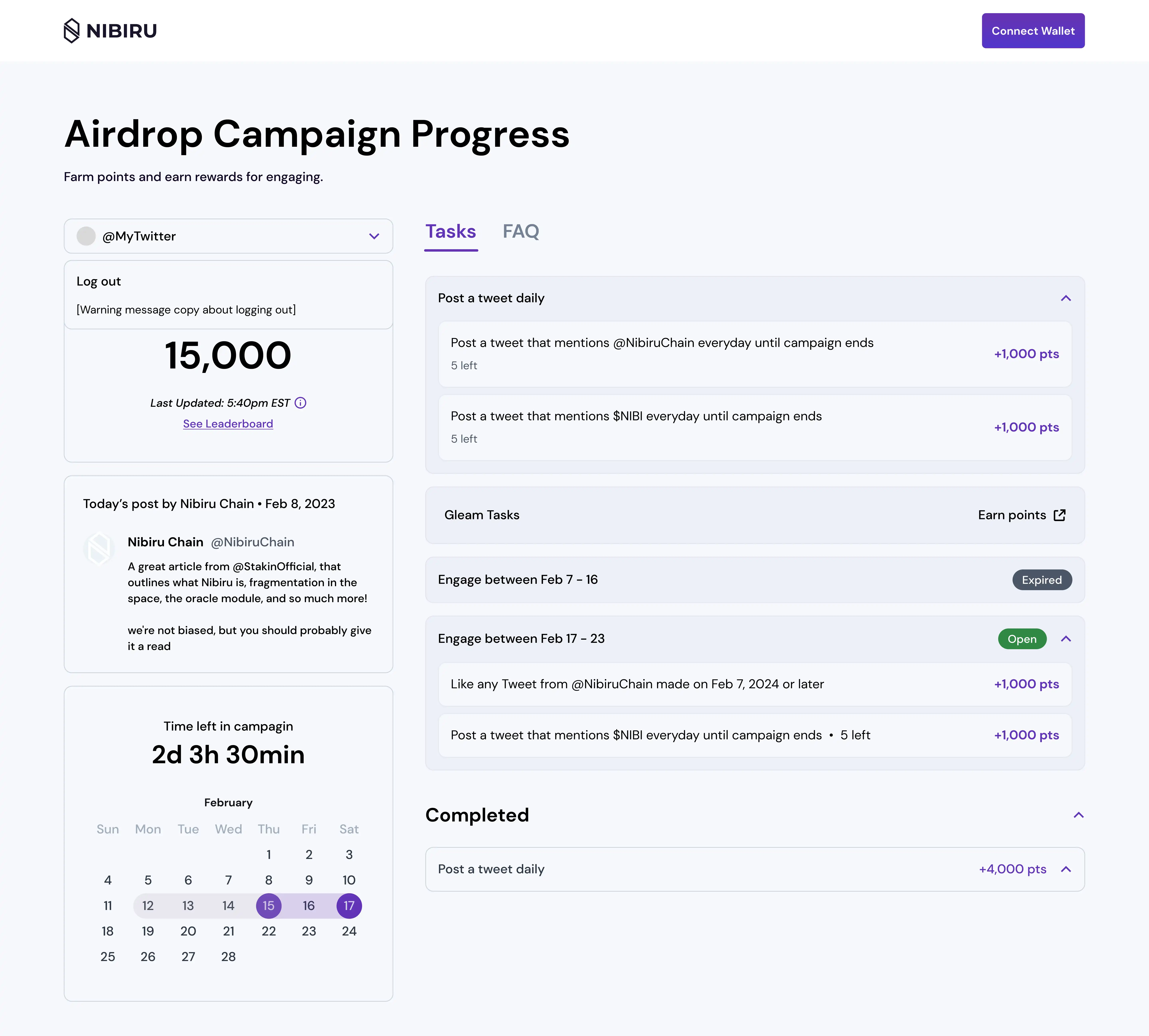 一旦您连接了您的 X 账户并将其与与 Nibi 兼容的钱包关联,您就有资格通过 Gleam 完成特定任务来赚取额外的 Nibi 积分。在您开始之前,请注意,为了符合资格,Gleam 中的您的 X 和 Nibi 地址必须匹配。