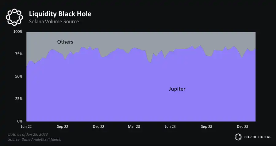 Jupiter是 Solana 最主要的 DEX 聚合器。它充当 Solana DeFi 的准前端,占据了超过 75% 的交易量。