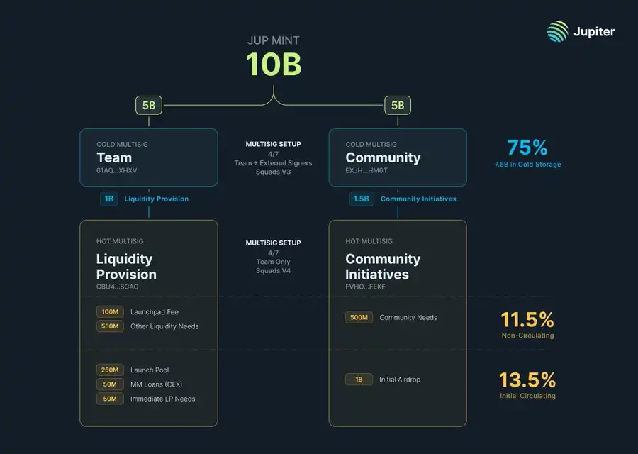 1 月 30 日,Jupiter 联创 Meow 在其社交平台更新 JUP 代币经济学,JUP 初始流通量将为 13.5 亿枚,其中 10 亿枚用于空投,2.5 亿枚用于 launchpool,5000 万枚用于 CEX 做市,5000 万枚用于链上 LP 需求。代币将于美国东部时间 1 月 31 日上午 10 点正式开放交易。此外,JUP Launch Pool 参数为:初始:0.4,最大值:0.7,曲线 1.6,2.5 亿代币。Meow 称这代表大约一半的代币将在 0.4-0.5 范围内可用,因此根据最终的需求和订单,早期用户可能会有足够的供应。