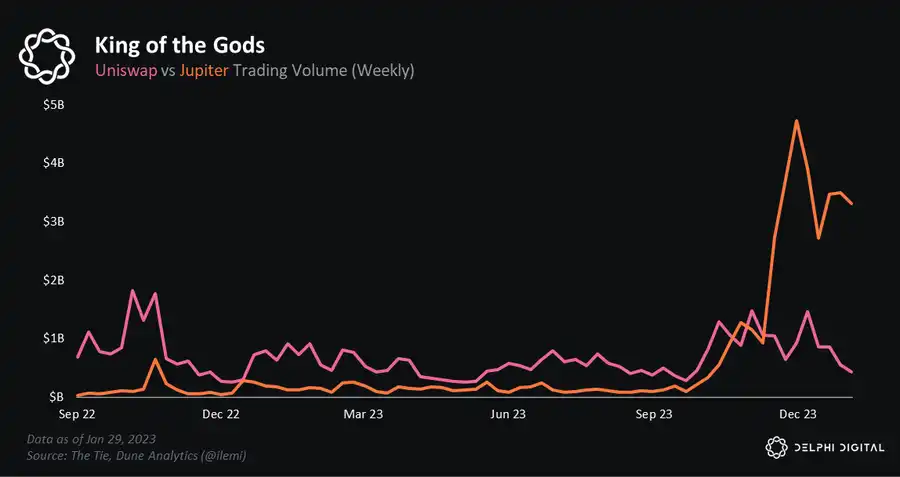 如今,Jupiter是一家巨头,提供五种产品:交换、永续合约、定投、桥接和限价订单。平均每周超过 35 亿美元的交换量,Jupiter已经开始超越 Uniswap。
