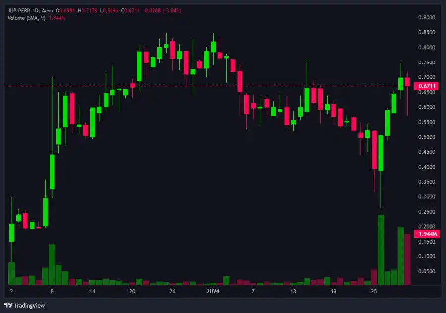 JUP 已经在一些预市场上交易,如 Aevo。在 Aevo 上,其价格目前为 0.67 美元,大致范围在 0.40 美元到 0.70 美元之间,历史最高价为 0.85 美元。