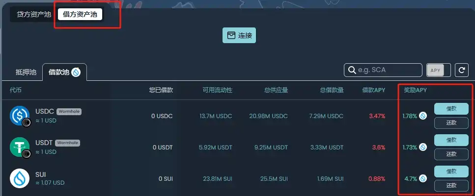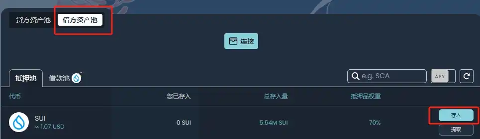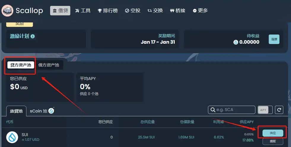 (3)点击贷方供应池,选择 Sui 代币供应(就是放贷,您将收到相应数量的 sSUI);