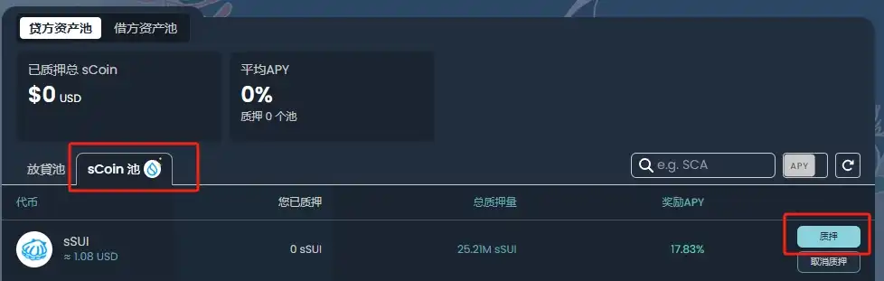 (4)点击 sCoin 池,质押是 SUI(有时你在第三步时会有选项,将 sSUI 直接质押进池,那么这一步可以忽略);