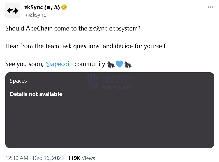 在看到 Polygon、Optimism 和 Arbitrum 的努力后,zkSync 也加入战争。12 月 16 日,zkSync 在 ApeCoin DAO 社区提议,「使用生产中最快、最便宜的 ZK 技术构建 ApeChain」