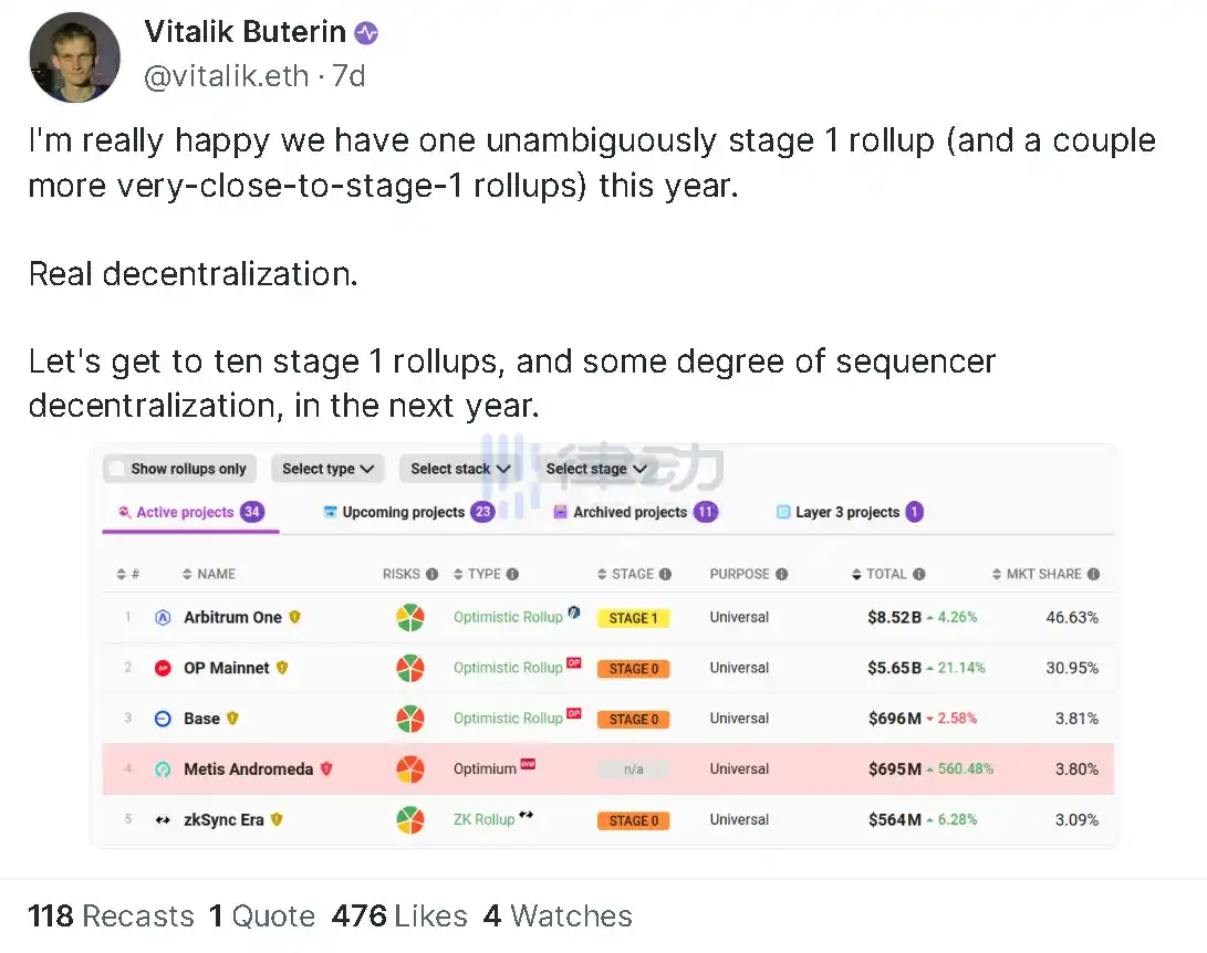Arbitrum 去年底获得了 Vitalik 的 良好评价,「这是真正的去中心化进步,希望明年可以看到十个 Rollup 进入第一阶段,并实现一定程度的定序器去中心化。」评论发布几小时后,ARB 价格上涨了 22%。