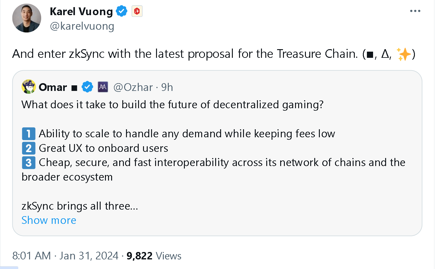 昨日,Optimism 联合创始人兼首席科学家 Ben Jones 提议 Treasure 加入 Optimism Superchain 并基于 OP Stack 构建 Treasure Chain。紧接着,zkSync 开发商 Matter Labs BD 负责人 Omar 今日在 TreasureDAO 社区发表提议,希望 Treasure Chain 使用 ZK Stack 作为 Layer2。