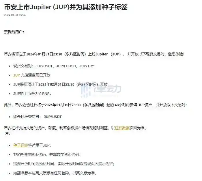 3. Binance 将上线 Jupiter(JUP),并为其添加种子标签;