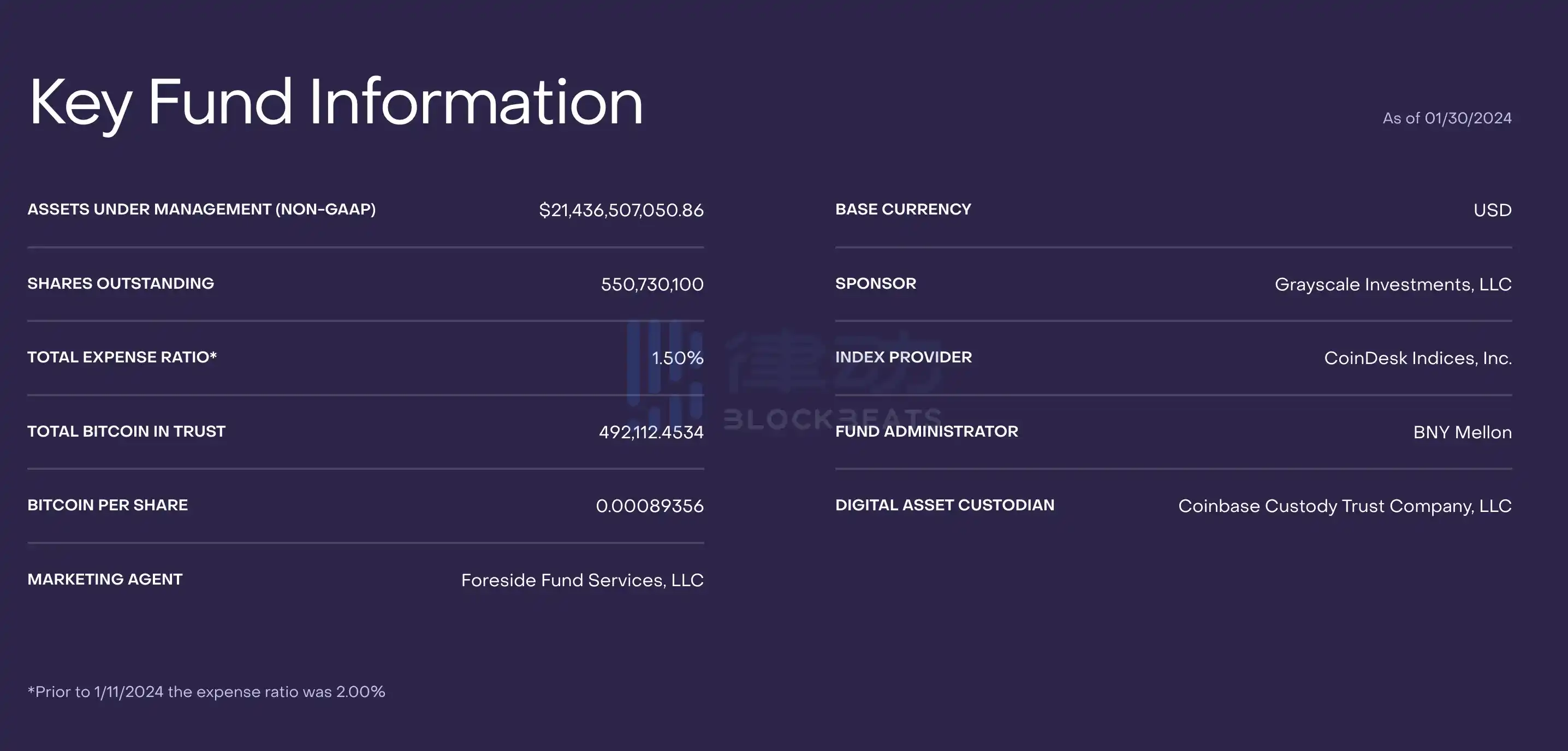 据灰度官方发布的每日持仓更新显示,截至 2024 年 1 月 30 日,其持有的比特币数量为 492,112.4534 枚,资产管理规模(非公认会计原则)为 21,436,507,050.86 美元,流通股 550,730,100 份。