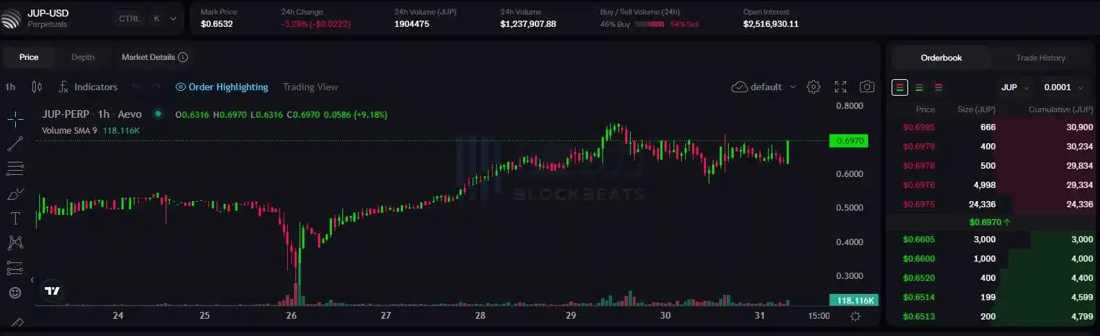 Aevo 上 JUP 期货价格现报 0.697 美元