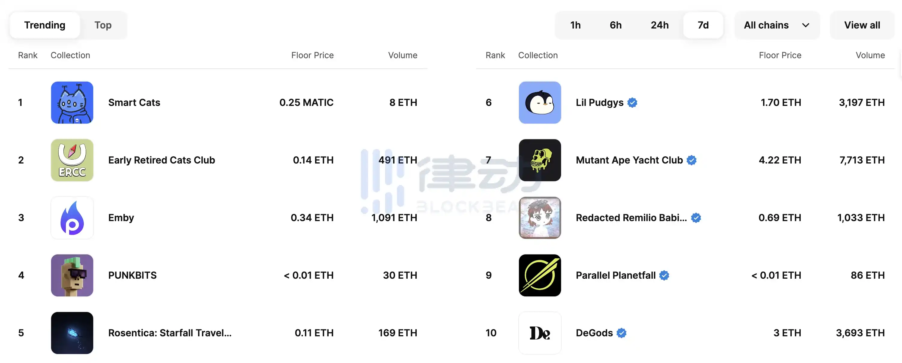 Smart Cats xNFT 位列 OpenSea 近七日热门趋势排行榜第一