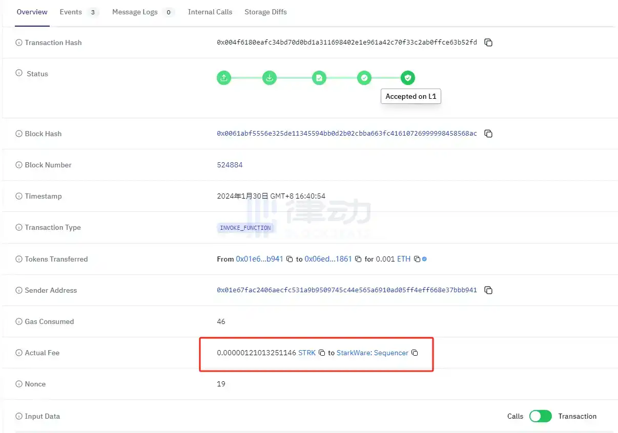据 Starknet 核心开发者 antiyro 在社交媒体上发布的链上数据显示,北京时间 1 月 30 日 16:00 左右,Starknet 网络的 524884 号区块中的一笔交易使用了 STRK 支付 Gas 费,该笔交易转移了 0.001 枚 ETH,或为测试交易。