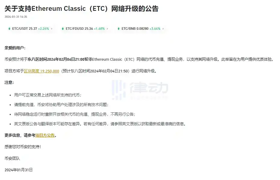 Binance 预计将于 2 月 4 日暂停 ETC 网络的代币充提业务,以支持其网络升级