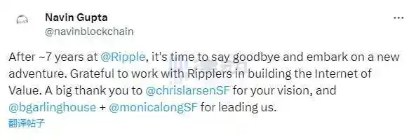Ripple 高管 Navin Gupta 宣布离职,已在 Ripple 任职 7 年