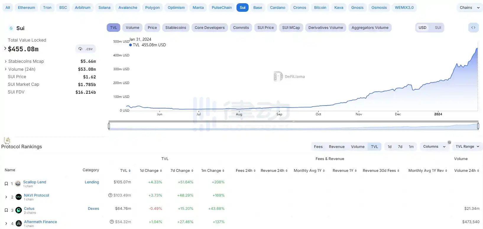 数据:Sui TVL 突破 4.5 亿美元,续创历史新高
