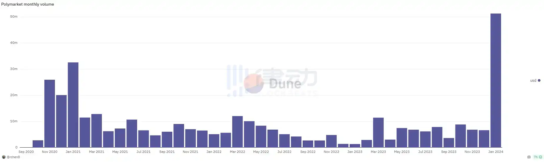 数据:预测市场平台 Polymarket 1 月交易额超 5100 万美元,创月度历史新高