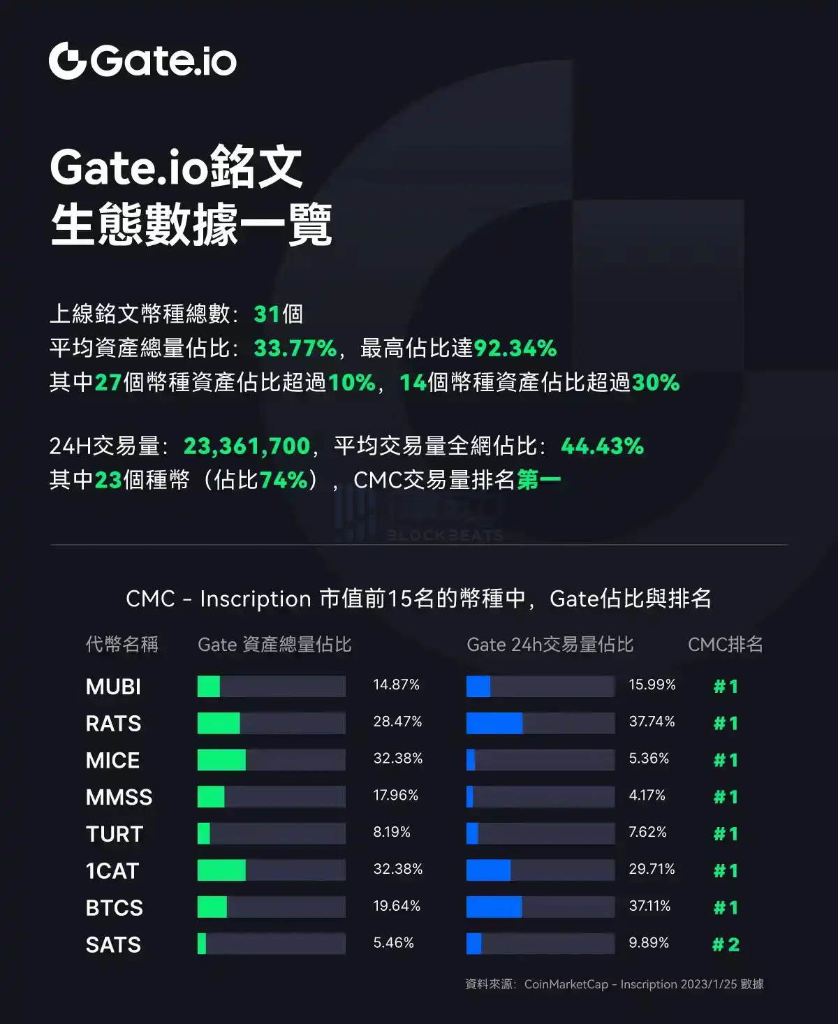 Gate 铭文数据报告:平均资产占比超 30%,74% 上线币种交易量排名第一