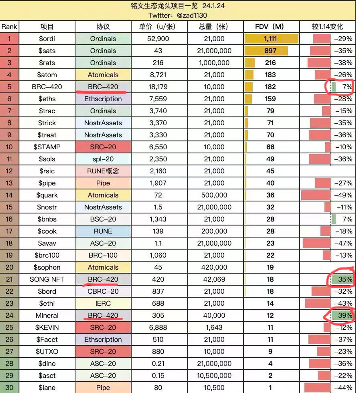 前段时间,一张社区整理的 1 月 24 日比特币社区资产涨跌幅表格传播度非常广,显而易见的是,当日 BRC-420 资产在铭文生态资产全面下跌时却逆势上涨。
