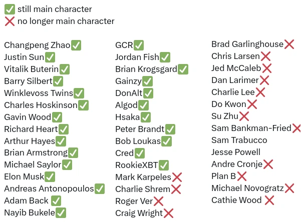 八个月后,我看到加密世界经历了一场截然不同的动荡:Sam Bankman-Fried 和 FTX 的公开消亡。当时,有人在 Twitter 上发布了一长串「加密主角」,显示哪些已经倒下,哪些仍然完好无损。这份名单的伤亡率很高:
