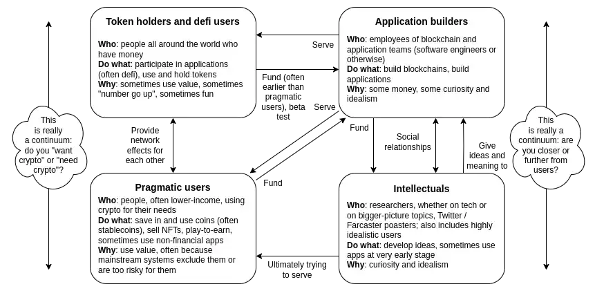 四个群体各自拥有复杂的动机,并且这些动机以各种复杂的方式与其他群体相互作用。也存在每个群体的「功能失调」版本:应用可能是剥削性的,DeFi 用户可能无意中加强了剥削性应用的网络效应,实用主义用户可能加深了对中心化工作流程的依赖,知识分子可能过于沉迷于理论,专注于通过指责人们「不一致」来试图解决所有问题,而没有认识到金融激励(和「用户不便」的去激励因素)也很重要,这些都可以且应当被解决。