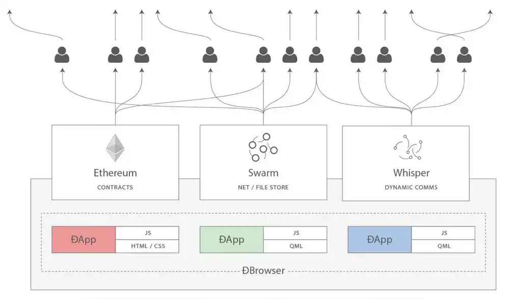以太坊的图表和两个提议的非区块链姊妹协议 Whisper 和 Swarm,Gavin Wood 在他的许多早期演讲中都使用了它们