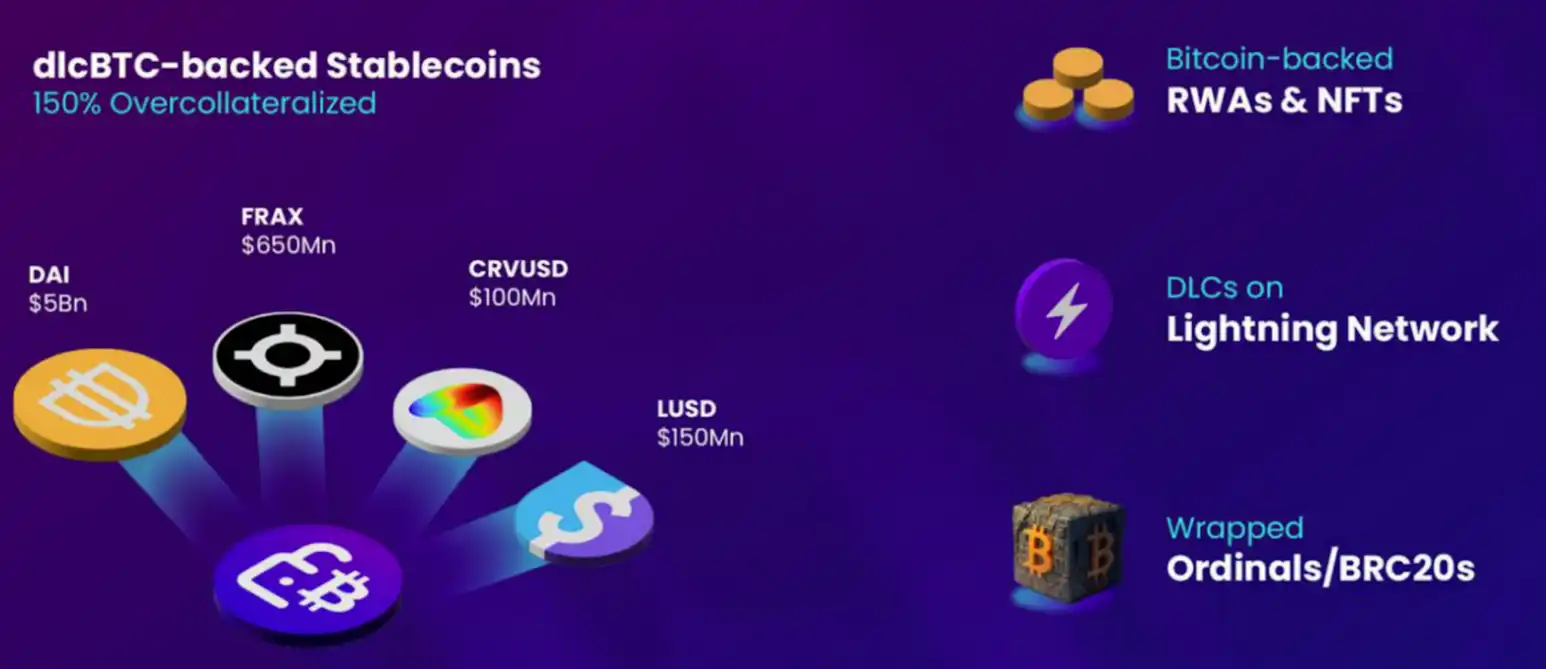 我们相信,在比特币之后,最去中心化的网络是以太坊。因此,通过 dlcBTC,我们致力于将原生 BTC 引入到以太坊网络的 DeFi,而无需构建另一个规模小、未经测试且更加危险的 L2 或解决方案。铸造的 dlcBTC 代币在知名的 DeFi 平台 (如 Curve 和 AAVE) 中作为抵押品使用,并使用户能够积极参与 DeFi 活动,如投资、贷款和对冲等。