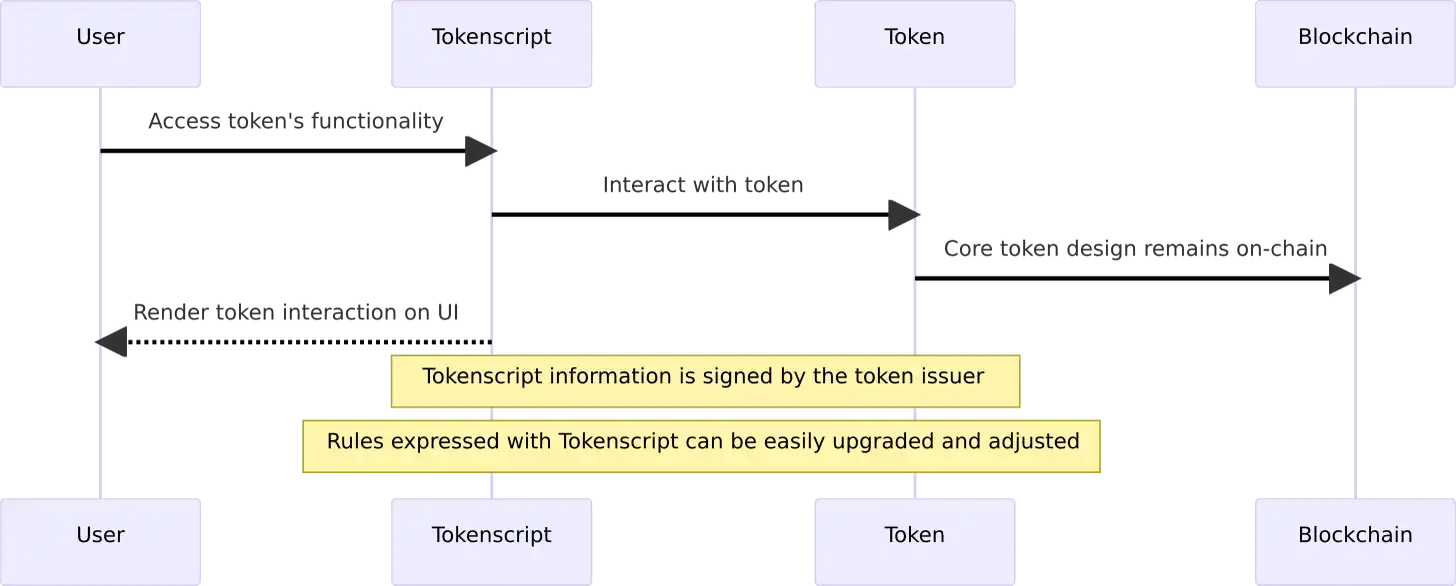 简单来说,TokenScript 是一个带有 XML 标记的 JavaScript 代码层,描述了与代币相关的属性、逻辑、操作和用户界面等要素。TokenScript 文件由对应的代币发行者发行和签名,可以由任何集成了 TokenScript 引擎的服务或设备导入。且代币发行者可以将任何信息和规则添加至代币中,而不受到智能合约的限制。Tokenscript 的主要重点是允许代币在不同平台和钱包之间无缝运行的同时,能够集成代币所有信息,方便用户管理和了解资产。目前 AlphaWallet 钱包已经支持所有以 TokenScript 标准实现的代币。