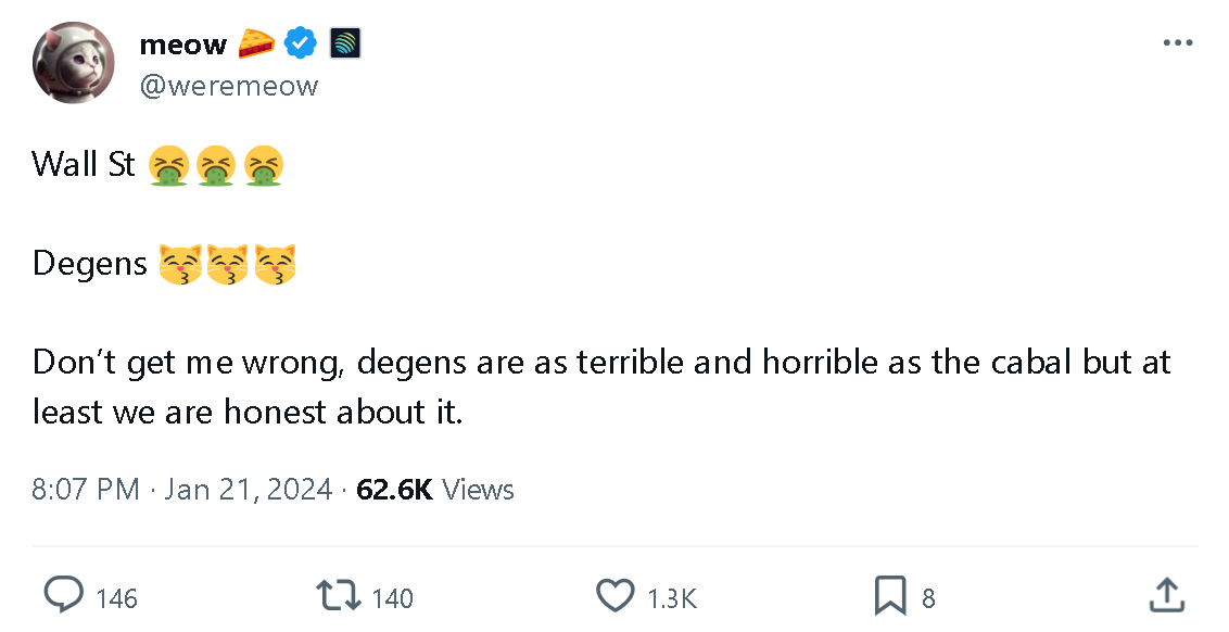 Meow:而且我想说,你也可以成为一个 Degen。我不会说,任何一名 Degen 比华尔街更好,毕竟他们都一样。