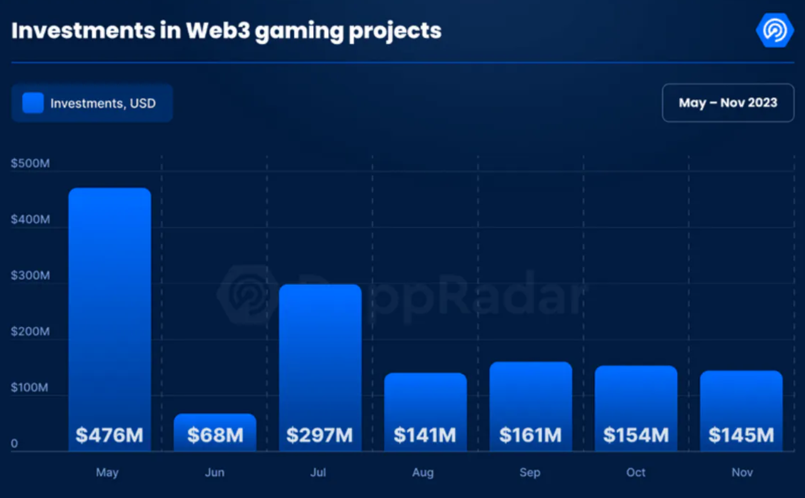 根据 DappRadar 和 BGA 发布的报告*中的数据,仅在 2023 年 5 月至 11 月期间,区块链游戏的投资就达到 14 亿美元,但更广泛的游戏行业的投资数量和交易价值则持续下降。