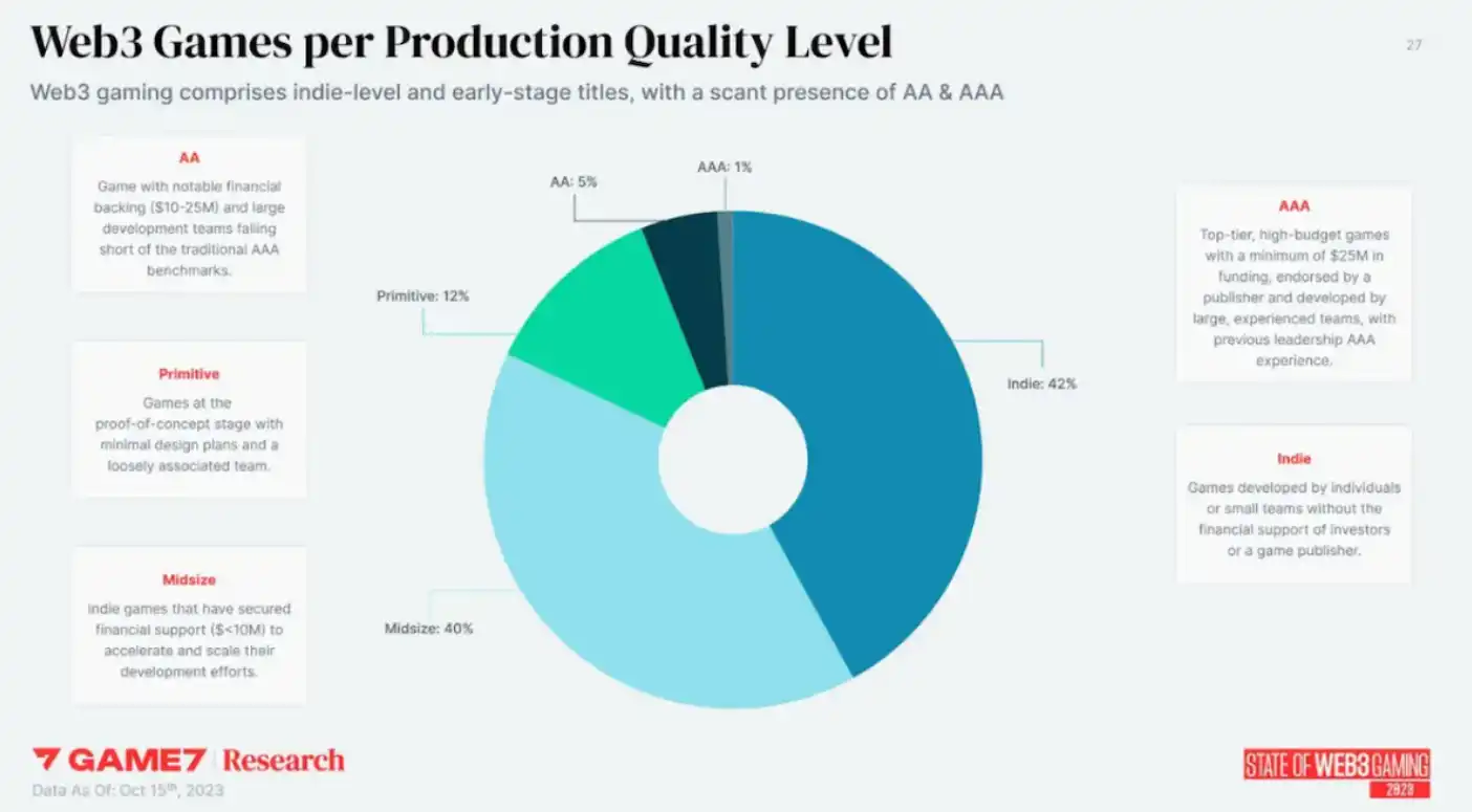 根据 Game7 的报告,绝大多数区块链游戏都是独立或中型项目,AA 和 AAA 资金水平仅占市场的 6%。Game7 发现,今年所有新区块链游戏中有一半来自亚洲,以游戏为中心的区块链总数同比增长了 84%。