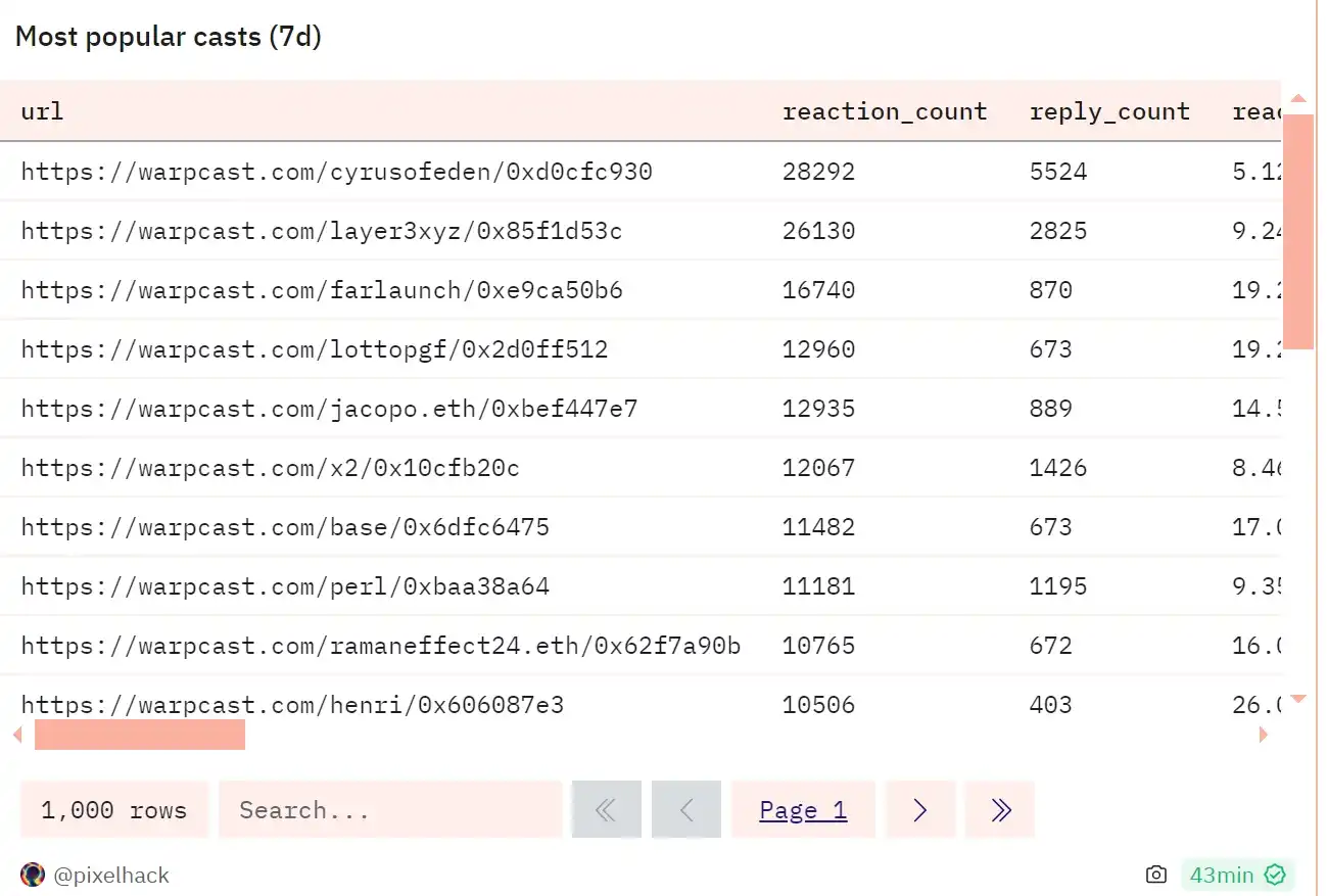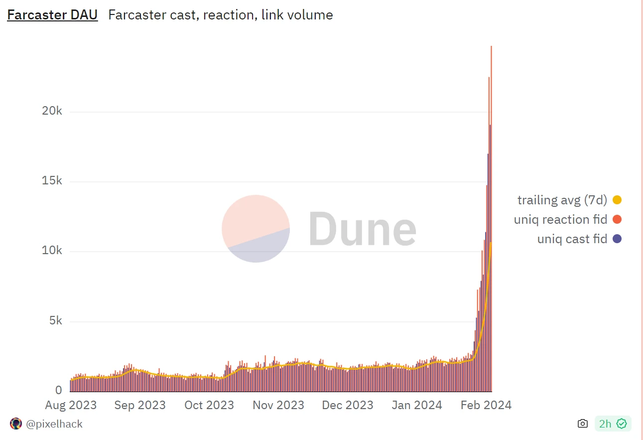 该功能的推出使 Farcaster 的 DAU(每日活跃用户量)激增,从 1 月 26 日开始,不断突破新高。下图是 pixelhack 整理的 DUNE 数据仪表盘。