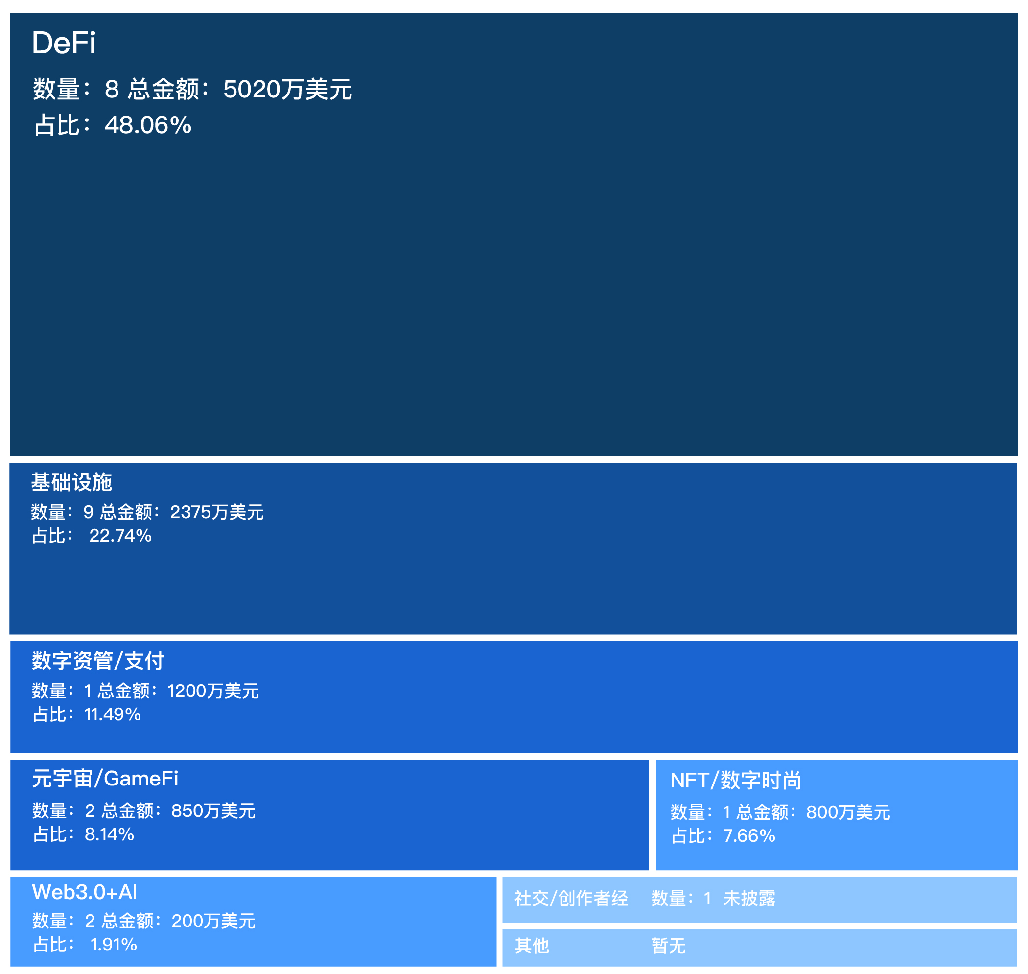 在 DeFi 领域共计 8 笔融资,总金额超 5020 万美元,占上周融资总额的 48.06%。