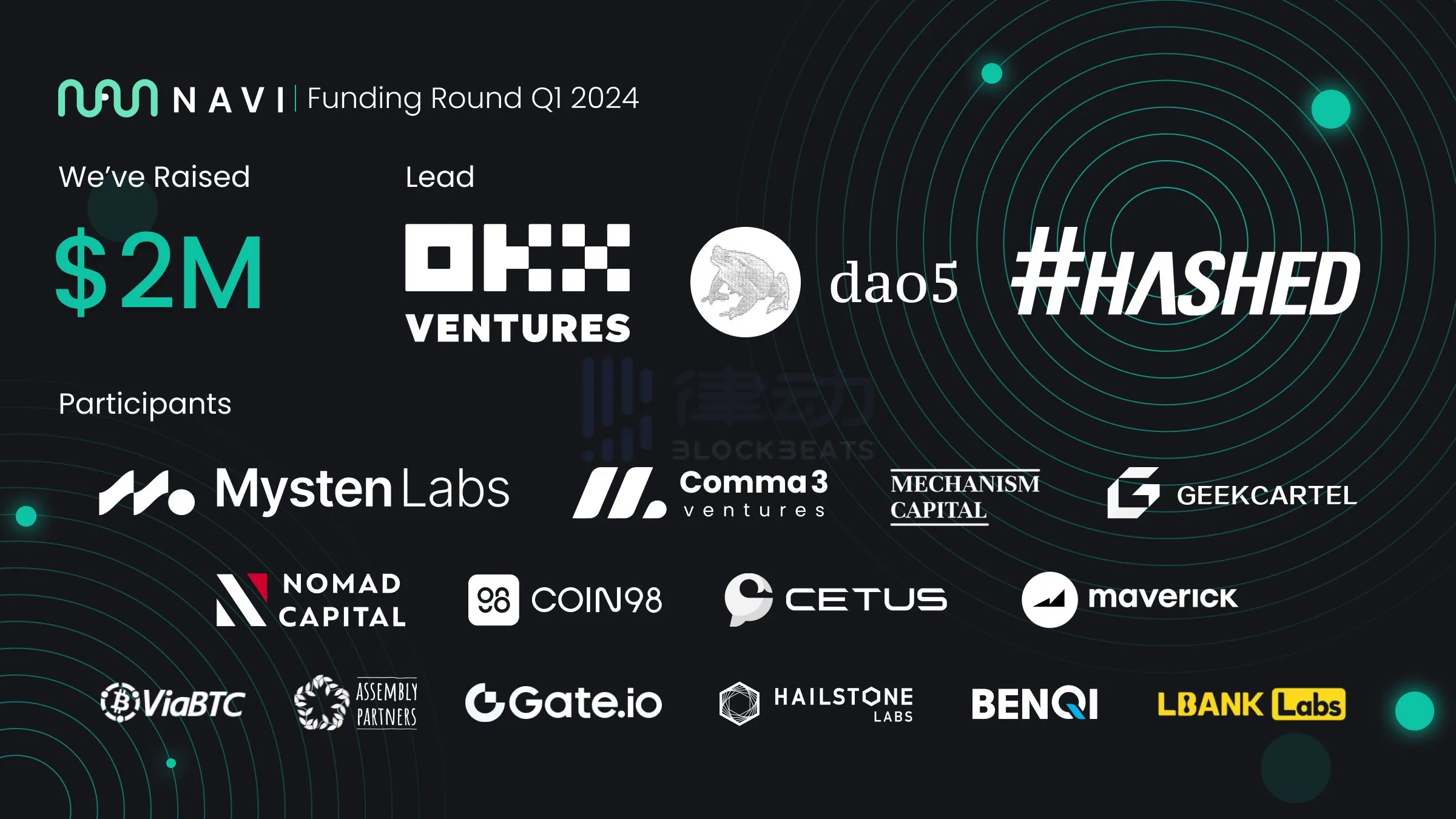 1 月 31 日,据官方消息,Sui 生态一站式流动性协议 NAVI Protocol 宣布完成 200 万美元融资,OKX Ventures、dao5 和 Hashed 共同领投,Mysten Labs、Comma3 Ventures、Mechanism Capital、GeekCartel Capital、Nomad Capital、Coin98 Ventures、Cetus Protocol、Maverick、Viabtc、Assembly Partners、Gate. io、Hailstone Labs、Benqi、 LBank Labs 等参投。NAVI Protocol 将利用此轮融资资金扩展其一站式借贷和 LSDeFi 平台。